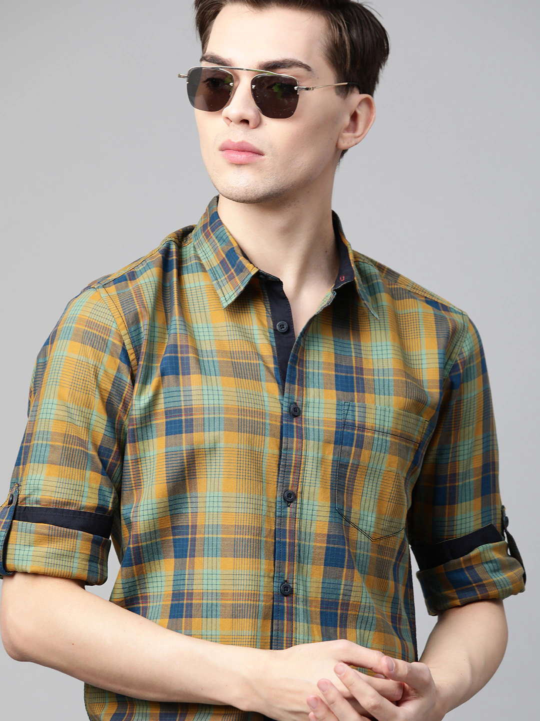 Men Mustard Yellow & Navy Blue Checked Casual Shirt