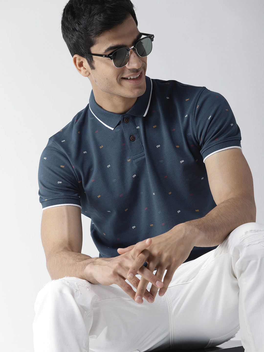 Men Navy Blue small Printed Polo Collar T-shirt